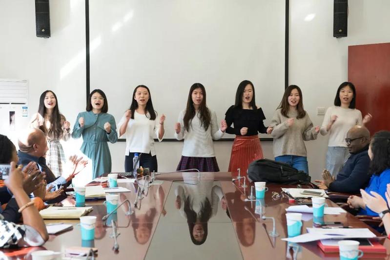 2015级斯瓦希里语专业员工为坦桑尼亚代表团献上斯语小合唱。坦桑尼亚代表团和职工们反应热烈,现场气氛十分活跃。