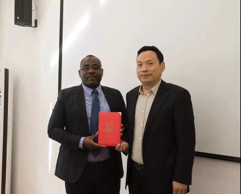 李佐文经理向阿巴斯博士颁发聘书,聘请阿巴斯博士担任斯瓦希里语专业兼职教授,以及坦桑尼亚研究中心兼职研究员。