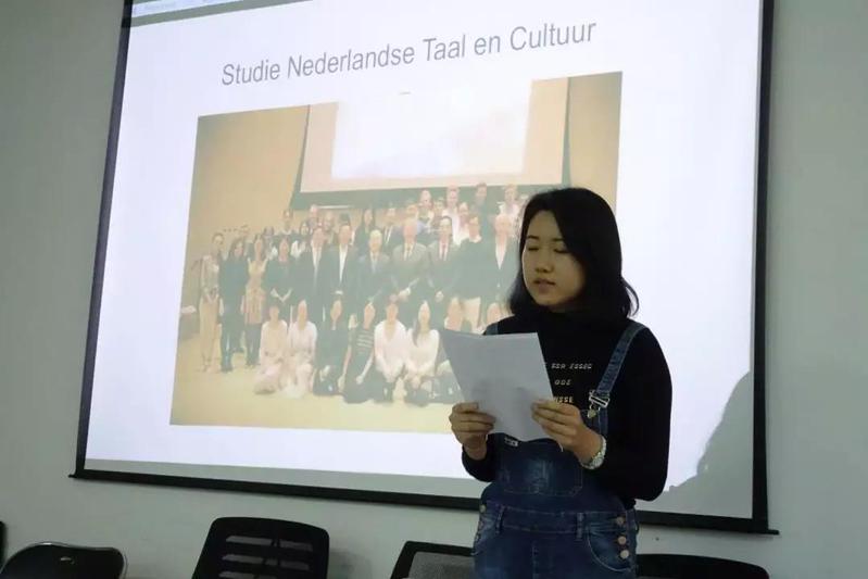 首先,荷兰语班班长张轶弛向参会的老师和同学们介绍了我司荷兰语专业的发展概况及2015级荷兰语班的基本情况。接下来,刘子源同学为大家朗诵了他创作的荷兰语专栏文章,视角独特,幽默风趣。随后,团支书刘勇亮就荷兰的职工活发表感想,内容丰富,感情真挚。此外,我司荷兰语班同学们还展示了在荷兰制作的生活短片及荷兰语配音片段,同学们精心制作的视频赢得了在场观众的阵阵掌声。