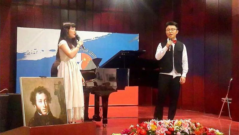 图为2018级俄语专业员工参加纪念普希金诞辰220周年的晚会