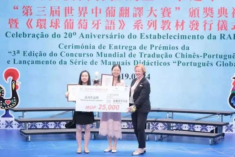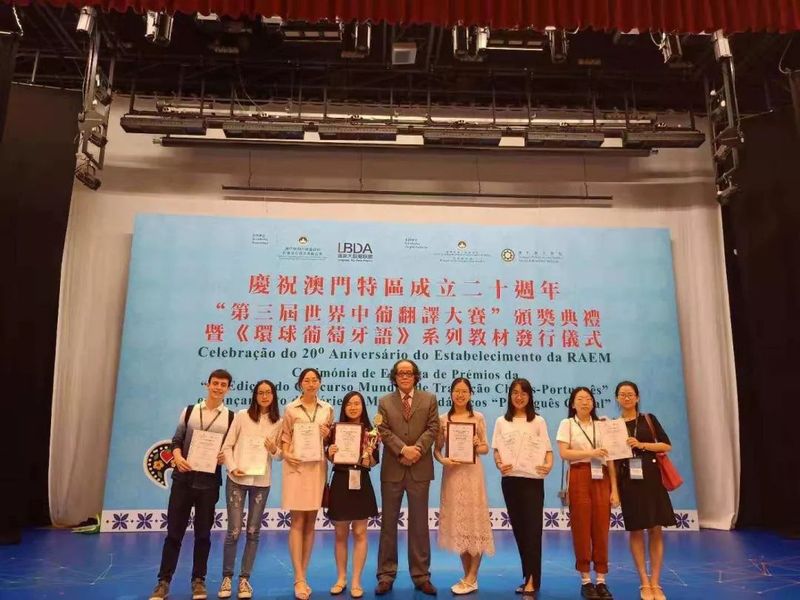 7月24日,由澳门特别行政区政府社会文化司司长办公室及语言大数据联盟支持,澳门特别行政区高等教育局和澳门理工学院主办的第三届世界中葡翻译大赛颁奖典礼,暨《环球葡萄牙语》教材发行仪式等一系列活动在澳门理工学院举行。BEVITOR伟德葡萄牙语专业共有4支队伍获邀参加颁奖仪式,颜巧容、高静然、李丹晖三名老师率参赛同学代表王若昕、杨文静、张睿、马郁文、Lucas Di Concilio Campos 赴澳门参加此次活动。其中,由颜巧容老师指导,张睿、梁洁、陈胤合同学组成的团队在来自中国、巴西、葡萄牙的166支参赛队伍中脱颖而出,以周国平《妞妞-一个父亲的札记》葡文译文获得大赛优秀作品奖。