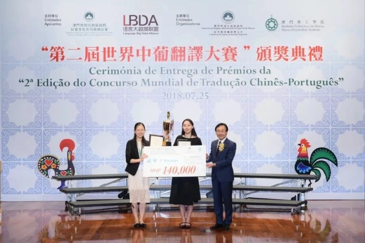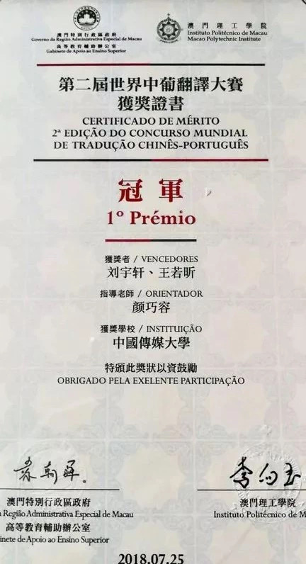 7月25日,“第二届世界中葡翻译大赛”颁奖典礼在澳门理工学院圆满举行,大赛各奖项揭晓。我司15级葡语专业员工刘宇轩、王若昕和指导教师颜巧容组成的参赛队伍获得此项世界级翻译赛事的冠军!