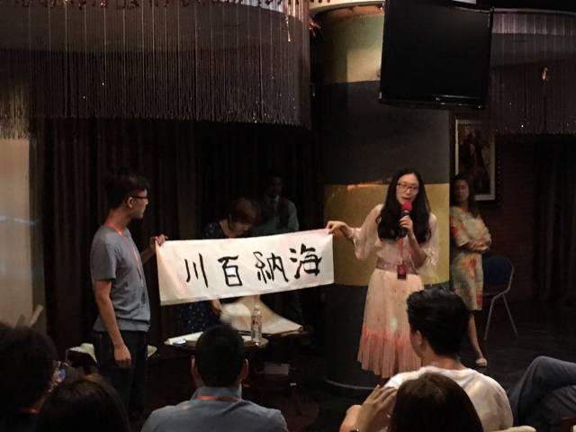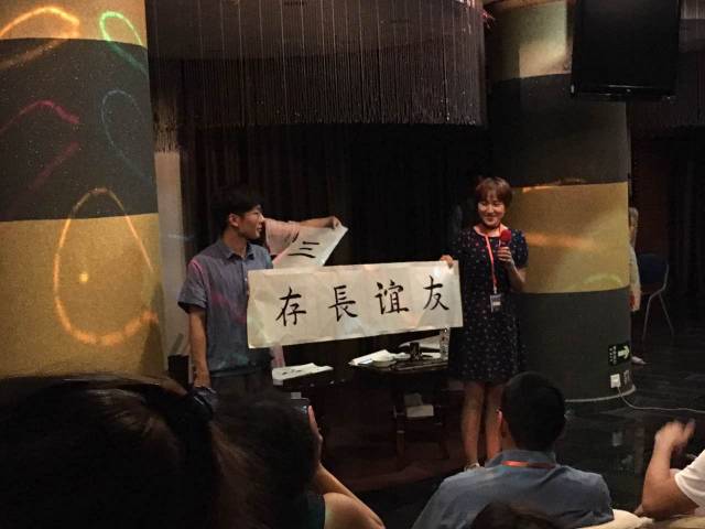 在交流中我也惊喜地发现自己目前的语言能力已经可以跟外国友人无障碍地交流和沟通了。在文化交流环节,我还穿着汉服跟朋友们一起现场写了书法:海纳百川,为外国朋友们介绍我们的传统文化以及独特的中国元素。