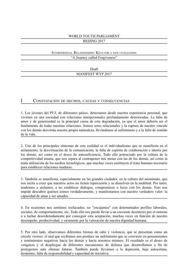 很高兴能有这样一个与各国青年一起工作、交流的机会。这次大会关注的是人际关系处理当中的问题。起初拿到大会的草案时我很不理解:为什么要揪住这么一个基本的问题来研究呢?不过,随着交流和讨论的不断进行我逐渐意识到:文化之间根本的差异正是隐藏在这些基本、甚至被归于“毫末”的问题之后,在讨论中我能够感受到不同国家青年在处事方法和价值观上的细微差异;当然,人类共有的普世精神恰恰也凝结在这些最基本的问题之中,各国青年都有着相同的慷慨与爱。在这短短的几天里,我了解了各国的不同文化,也解释了许多有意思的人:幽默风趣的西班牙老先生、精通四门语言的德国小姐姐、热爱意大利文化的俄国摄影师、立志成为总统的西班牙小哥、热情开朗的美国历史教师、喜欢大笑的印度朋友……总之,我们虽然有着不同的肤色、操着不同的语言,却同样拥有热爱生活的心、有趣的灵魂。希望更多的青年人能够以更加开阔的视野来迎接这个崭新的时代,力争在实现自身价值的同时一同推动世界的发展。