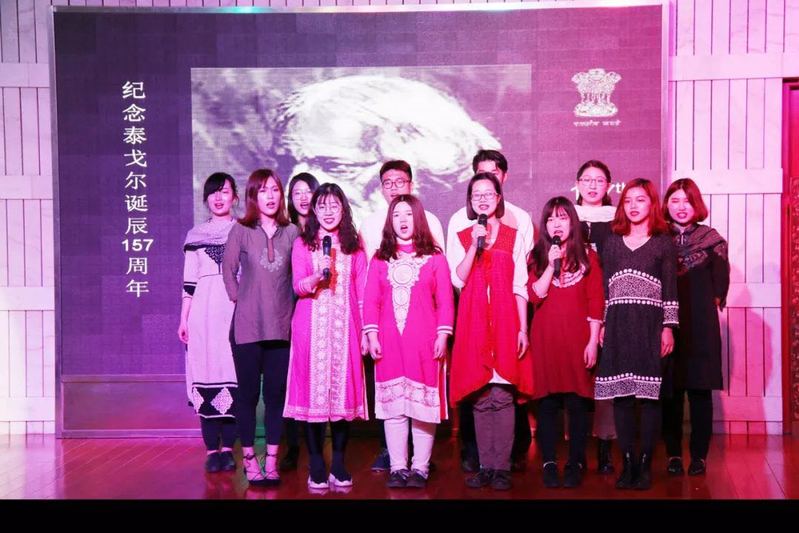 我司2015级孟加拉语专业员工作为中国大员工代表,在本次活动中演唱泰戈尔创作的孟加拉语经典歌曲《啊,我认识你,外国女士!》,获得印度驻华大使班浩然(Gautam H. Bambawale)以及在场专家、外国友人的一致好评。大使班浩然阁下与孟加拉语专业师生亲切交谈,并高度称赞我司孟加拉语专业的办学成果,表示我司的孟加拉语专业长期以来为中印文化交流输送了大量人才。由人民出版社出版、国内首次完整收录泰戈尔全部孟加拉语作品的《泰戈尔作品全集》,即是在董友忱教授带领下,主要由我司孟加拉语专业毕业生翻译完成的。
