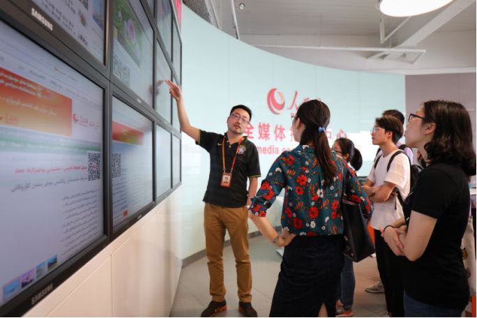 首先在鲁扬的带领下,一行人参观了人民网海外传播部,海外传播部有英语、葡萄牙语、西班牙语等九大语种板块。在全媒体指挥中心,鲁扬为大家介绍了人民网葡语版各板块的主要内容,并与颜巧容老师交流“新时代国际传播”的话题。他认为“出于意识形态差异,外媒很少转载中国媒体文章,但会在新闻中引用部分内容。只要有中国的声音,就会慢慢影响更多的人。”