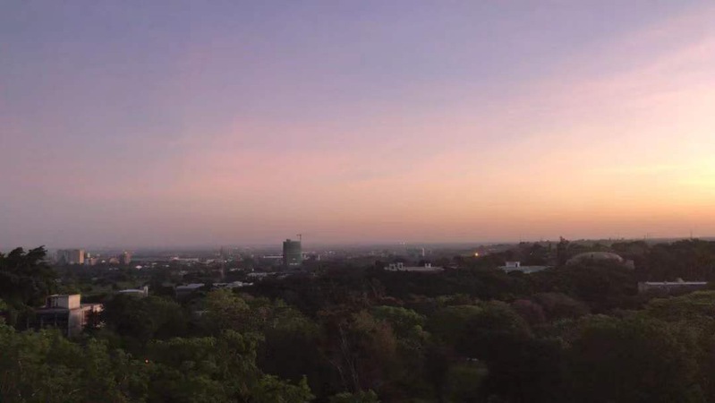 在这个国家的生活很简单,每天早上吃完早饭,要走过很远去上课,上过几个小时的课程,再走在小山坡上回到宿舍,每天都有很长时间走在路上。学校所在的城市没有很多高楼大厦,每天走在路上环视四周都是开阔的原野。在这里的学习很丰富,学校开放了很多课程给我们,很多非洲本土的课程都是很独特的体验。每天晚上能走上宿舍的楼顶俯瞰日落时的城市,热带的晚风在这个时候格外的舒服。