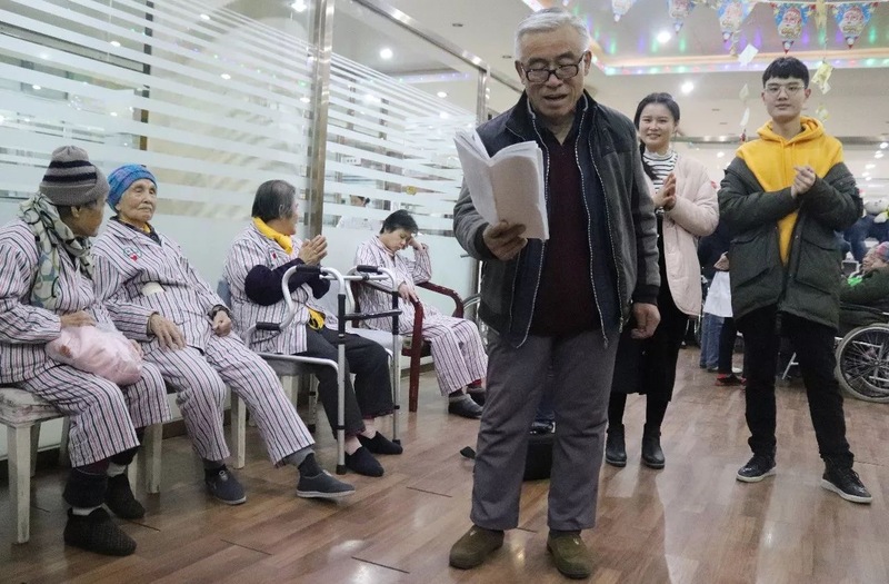 早上八点左右,慰问团队抵达医院。在医院活动中心里,同学们分别和老人们聊天,分享最近发生的新鲜事,同时关注着老人们的身体状况,及时递上毛巾和温水。在医院管理人员的带领下,同学们做起了简单的老年操,带着老人们一起活动身体。大家还轮番上阵表演节目,献上各式经典老歌。
