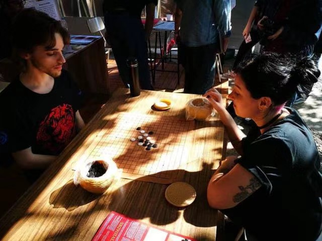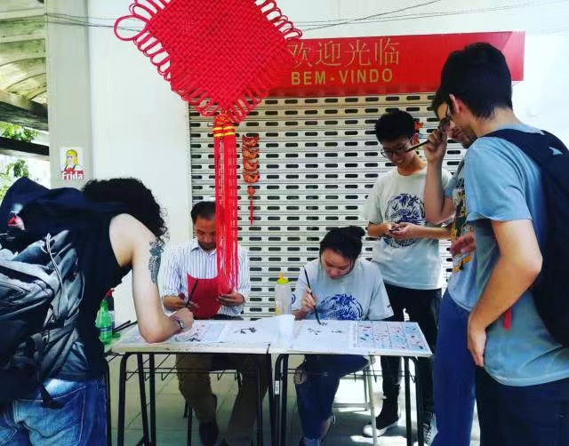 在学校学术周期间,孔子学院举办活动时,同学们作为孔院的志愿者,与孔子学院的老师们一起给外国员工表演中国书法、展示中国茶艺、教给他们如何下棋以及如何编中国结等。
