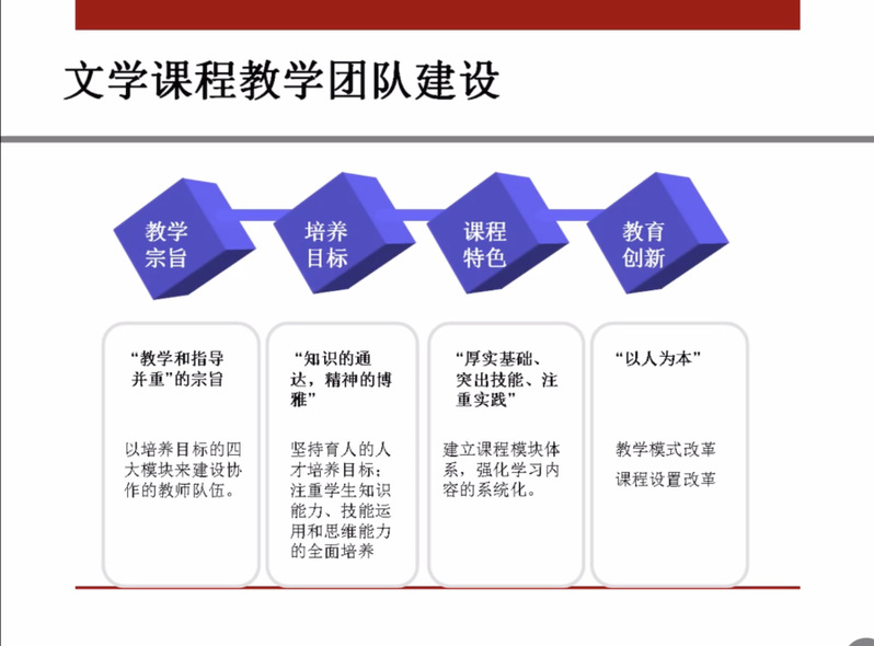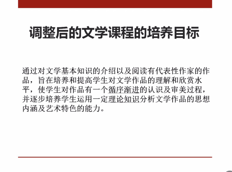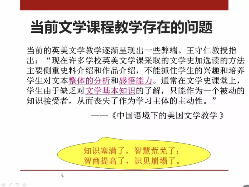龙云老师从当前文学课程教学存在的问题入手,向我们展现了当前英美文学教学中出现的一些弊端:员工作为被动的客体难以对文学课程投入主体积极性和兴趣,知识性的内容和作品的介绍虽然掌握了,但是对文本的整体分析能力和感悟能力却逐渐薄弱等。教学方式的史料性介绍使得员工的兴趣点得不到开拓,文学基本知识的缺乏使得作为知识接受者的员工人文素质得不到进一步提升。