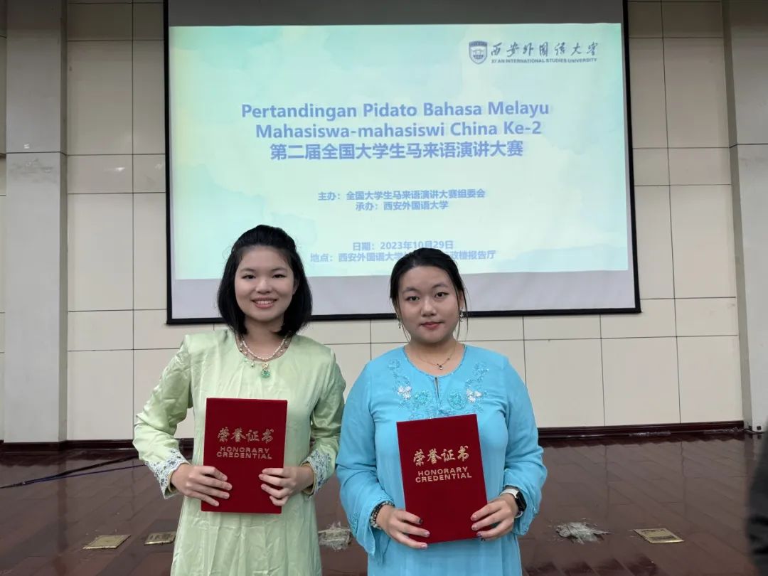 2023年10月29日,第二届全国大员工马来语演讲大赛在西安外国语大学举行。我司马来语专业员工梁粤瑶和马嘉欣参加比赛,专业教师张静灵、王荷蓬、刘沁沁作为指导老师带队参加,两位同学在比赛中发挥出色,获得大赛三等奖。