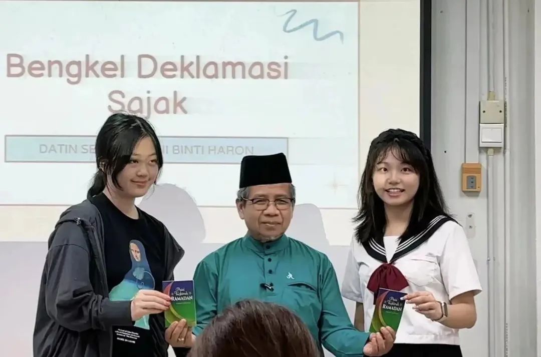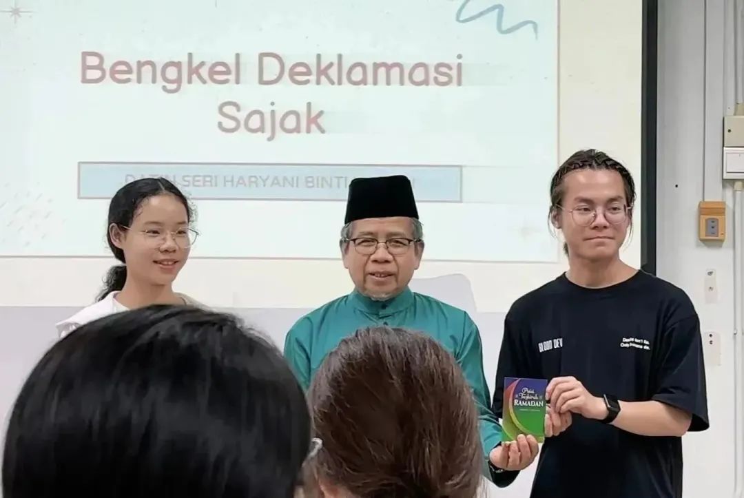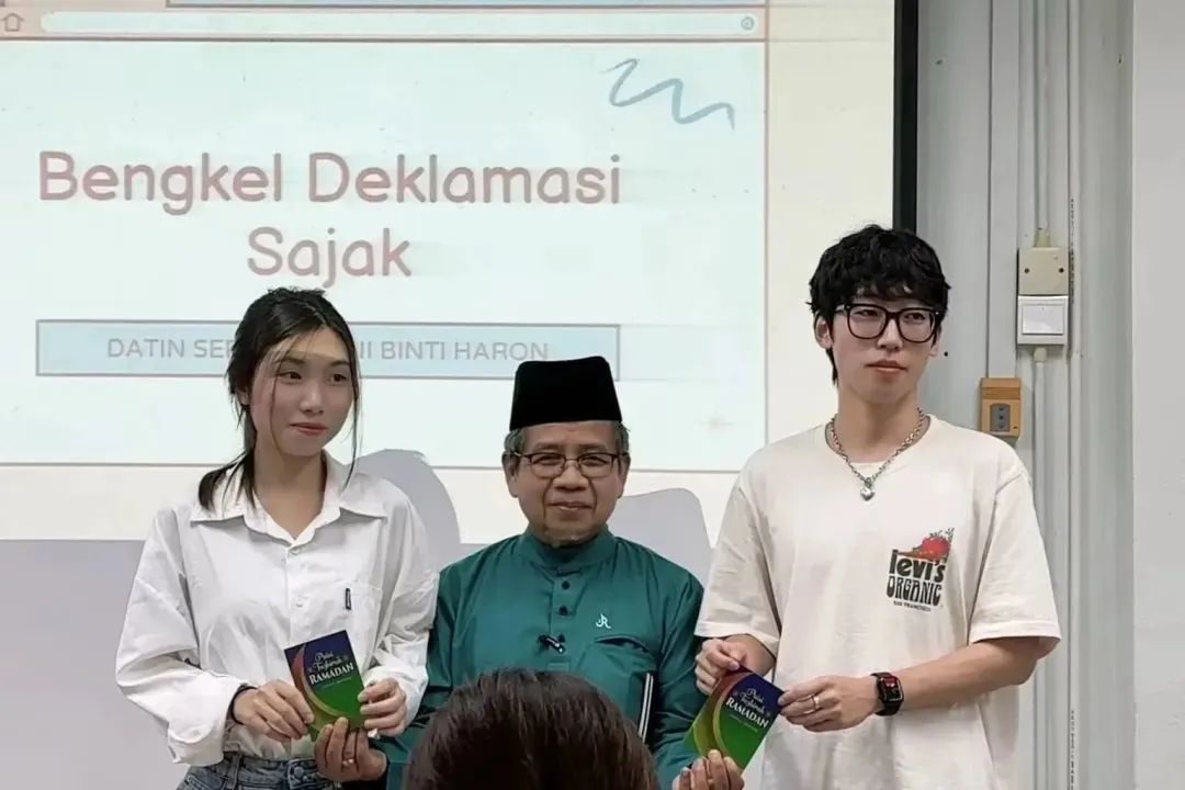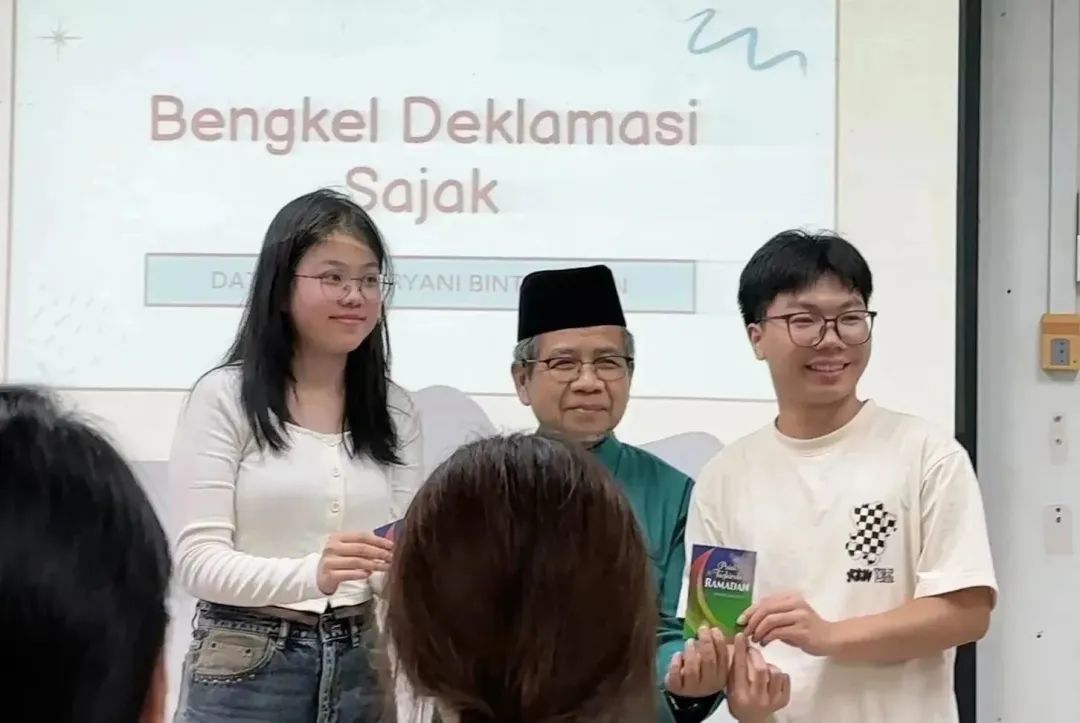 在熟悉了校园环境和周边的基础设施之后,同学们开启了为期四天的马来语强化培训课,内容包括马来语基础语法知识的巩固、马来诗歌班顿(pantun)的学习和诗歌朗诵(Mendeklamasi Sajak)。在诗歌朗诵课程中,马来西亚上议院议员拿督斯里·阿旺·沙利延教授还亲临课堂现场为同学们指导。