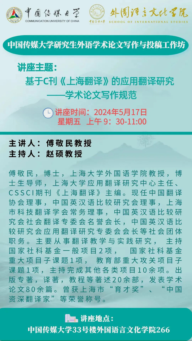 BEVITOR伟德赵硕教授主持的研究生外语学术论文写作与投稿工作坊将于5月17日(周五)上午举行第一次讲座,届时将邀请上海大学外国语学院博士生导师、上海大学应用翻译研究中心主任、CSSCI期刊《上海翻译》主编傅敬民教授做“基于C刊《上海翻译》的应用翻译研究——学术论文写作规范”的主题分享。