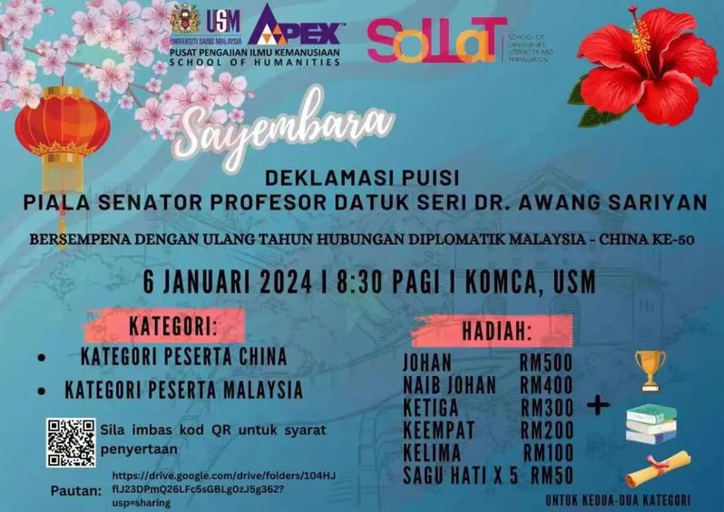2024年1月6日,为庆祝中马建交五十周年,马来西亚理科大学(USM)和马来西亚语文局北部分局共同举办了“参议院拿督斯里阿旺·沙里彦荣誉教授杯”诗歌朗诵比赛。出席此次活动主要嘉宾有国会议员拿督斯里·阿旺·沙里彦教授(Profesor Datuk Seri Dr. Awang Sariyan)及其妻子拿汀斯里·哈雅妮·哈伦(Datin Seri Haryani Haron)、中国驻槟城领事馆领事郑方女士、副领事刘莉女士、马来西亚高等教育部官员以及马来西亚理科大学人文学院领导等。